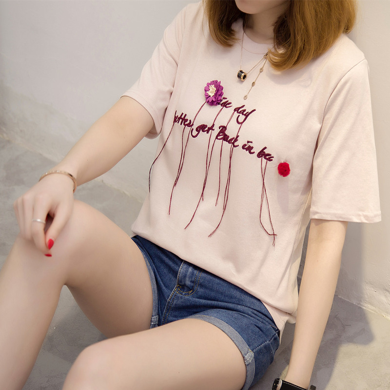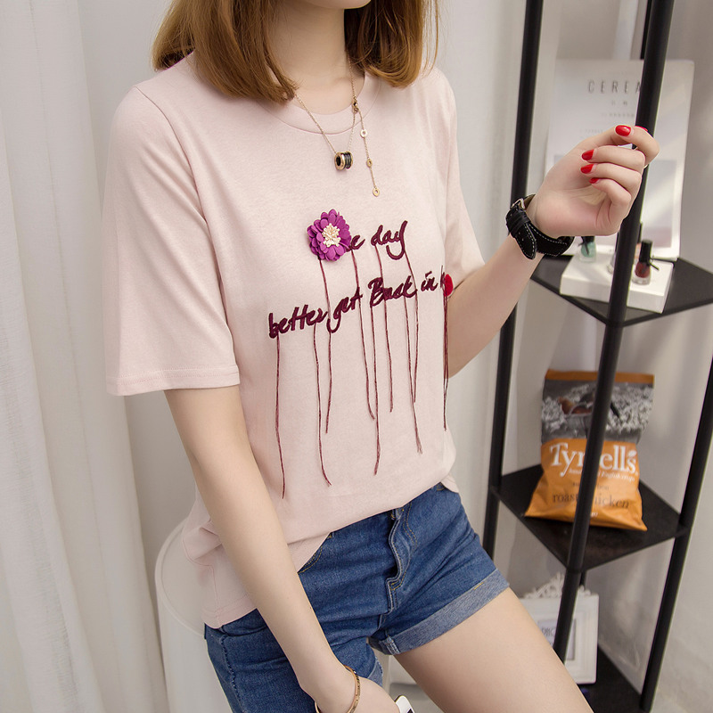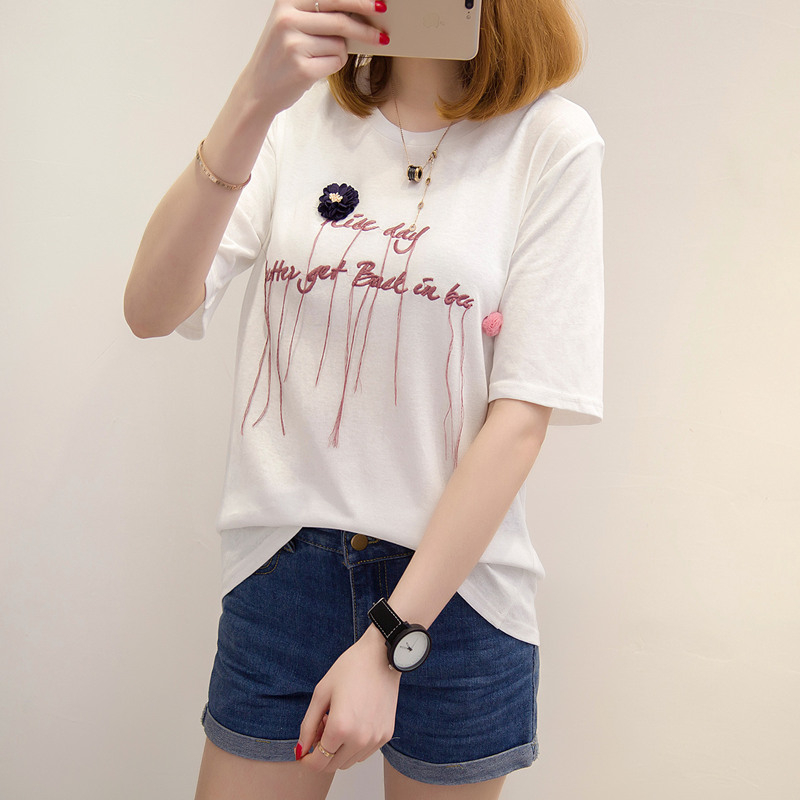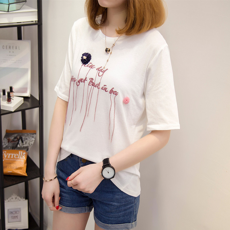 夏裝新款女裝寬松白色短袖t恤女立體字母咳韓版百搭上衣女夏