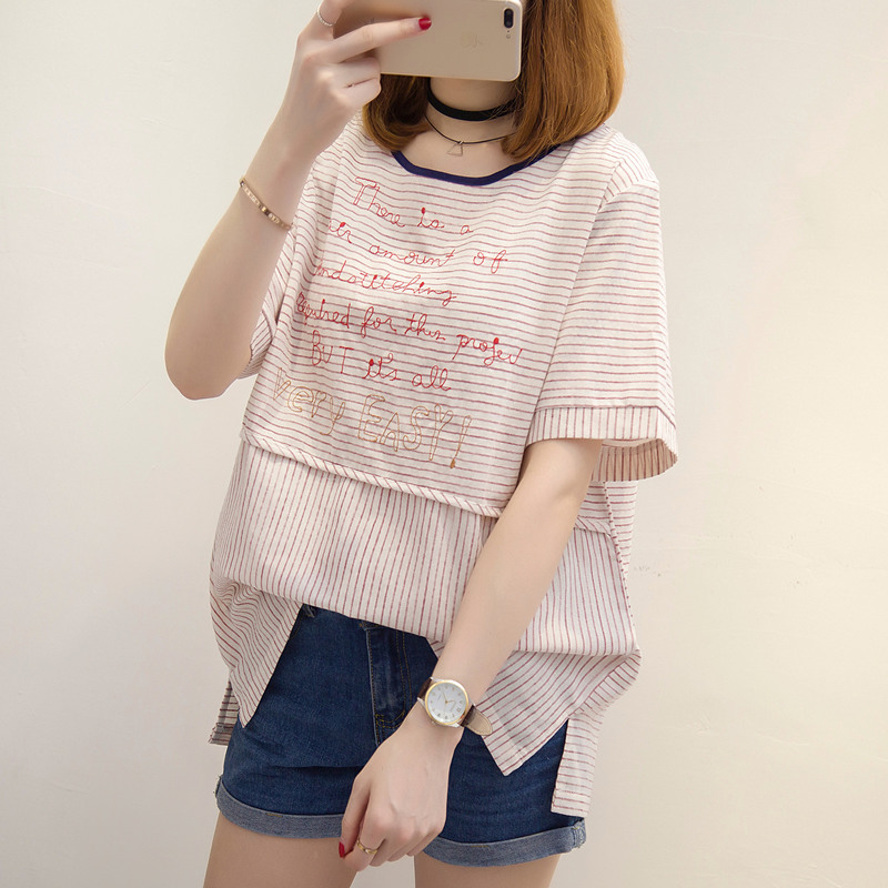 夏裝新款女裝條紋t恤女上衣韓版寬松拼接短袖體恤衫字母百搭