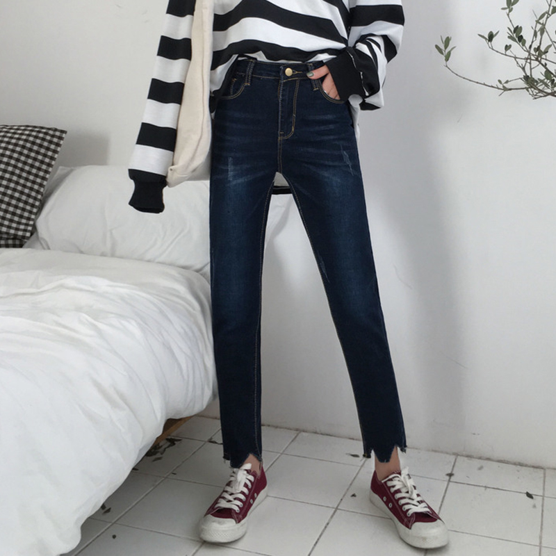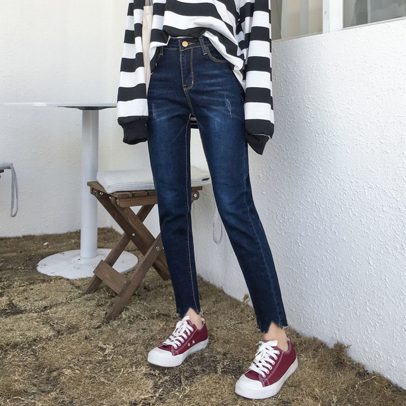 復古顯瘦高腰百搭彈力牛仔褲女秋冬裝新款學生不規則休閑九分褲子