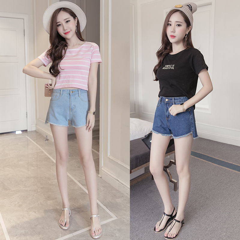 / 新款韓版寬松顯瘦牛仔短褲女春夏高腰淺色簡約毛邊牛仔褲熱褲