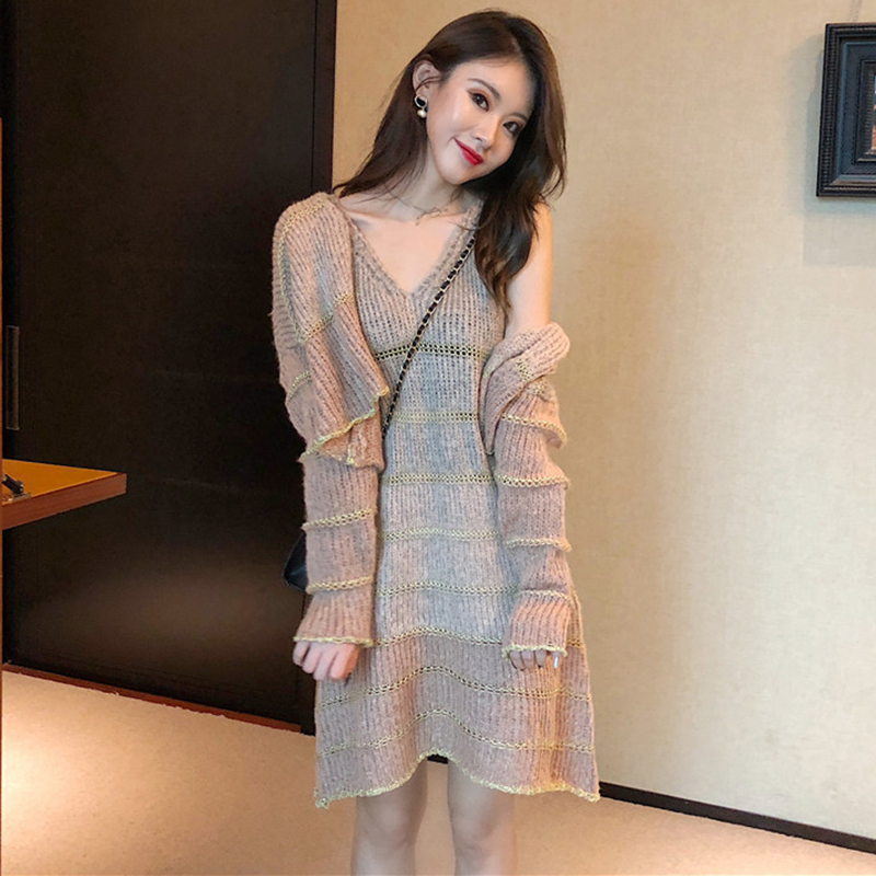 / 赫本套裝女秋冬新款慵懶長袖針織開衫短外套修身顯瘦吊帶連衣裙子