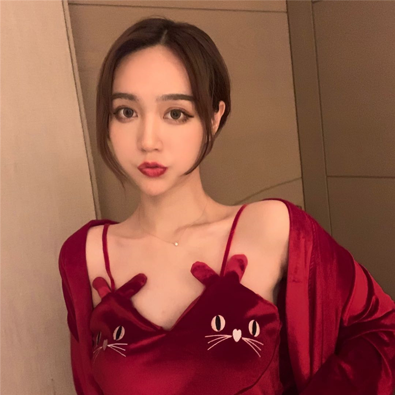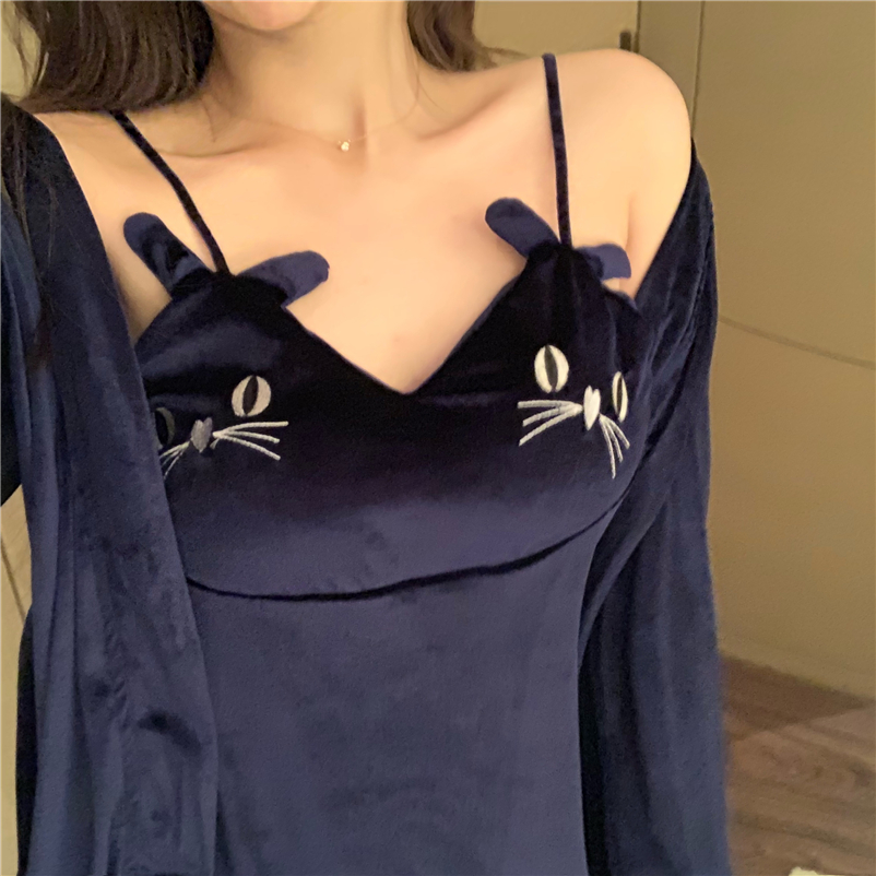 家居套裝, 金絲絨性感貓咪睡裙+長袖系帶睡衣 , 絨面質感的絲絨面料, 順滑富有垂感,彈力且保暖, 空調房家居服飾Shou選, 胸杯上可愛卡通貓咪圖案是精致繡花而成, 收腰裙型設計彰顯女性S曲線 ,十足用料的睡袍有系帶, 包容性好,保暖外穿都木問題的。 有寶藍色和酒紅色可選。 兩個顏色都高端大方顯貴氣。