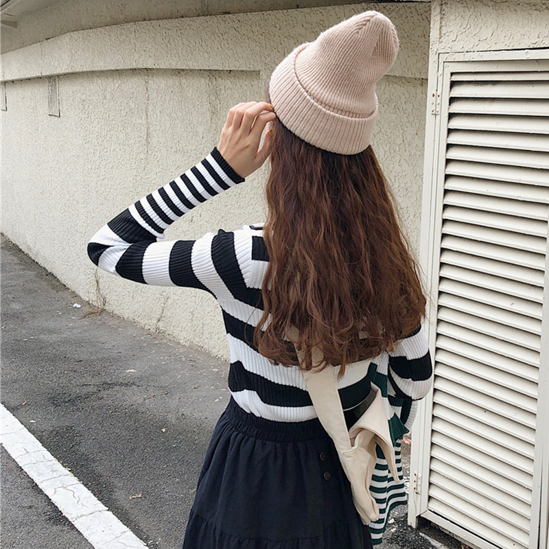 / 針織衫女韓版秋冬裝2018新款時尚條紋高領長袖T恤修身短款打底衫