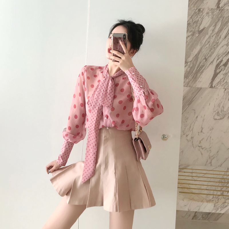 / 秋冬新款泡泡袖蝴蝶結領波點雪紡上衣高腰A字百褶半裙時尚套裝女