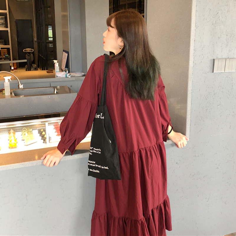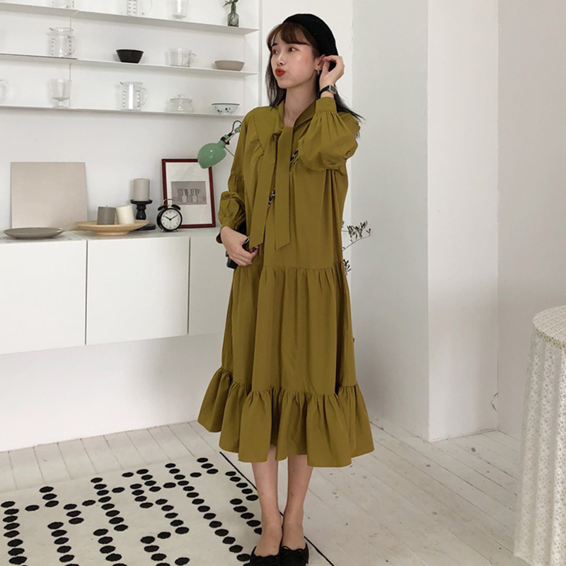 / 清新荷葉邊中長A字裙秋裝女2018新款韓版寬松系帶燈籠袖連衣裙子
