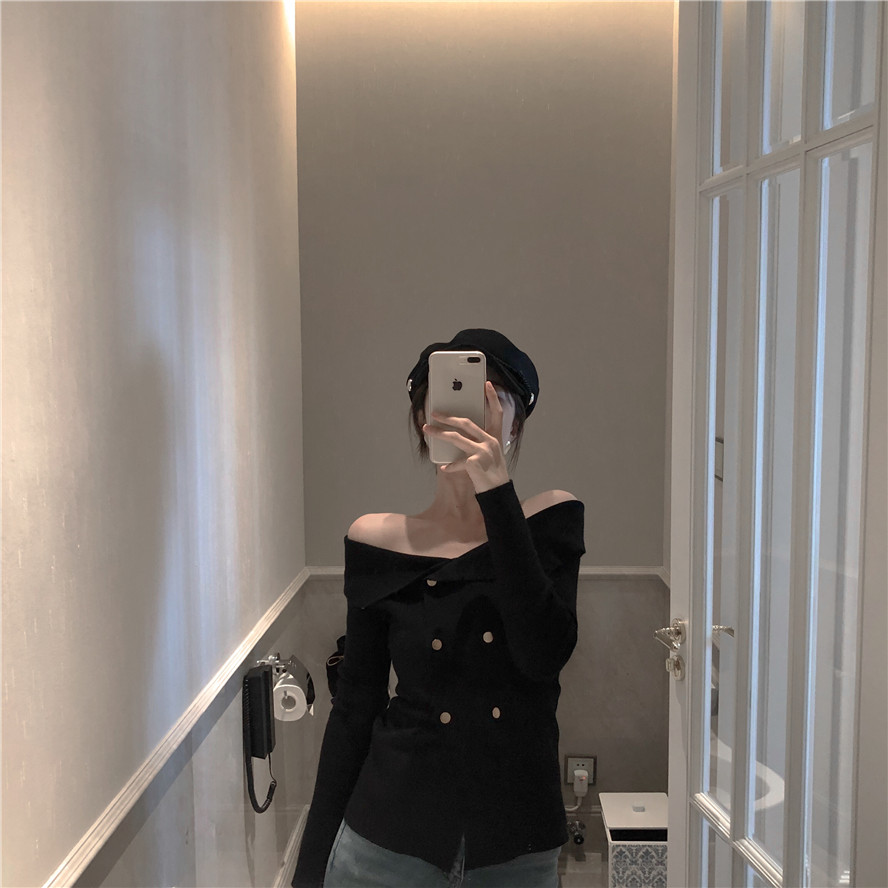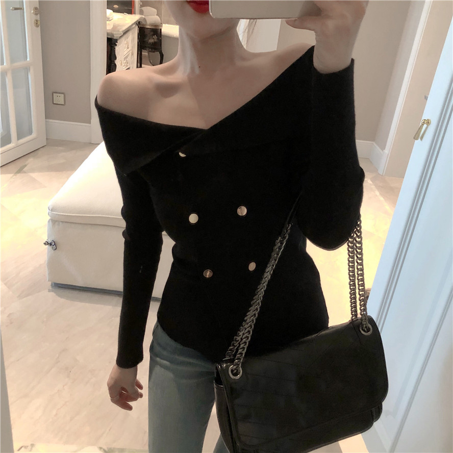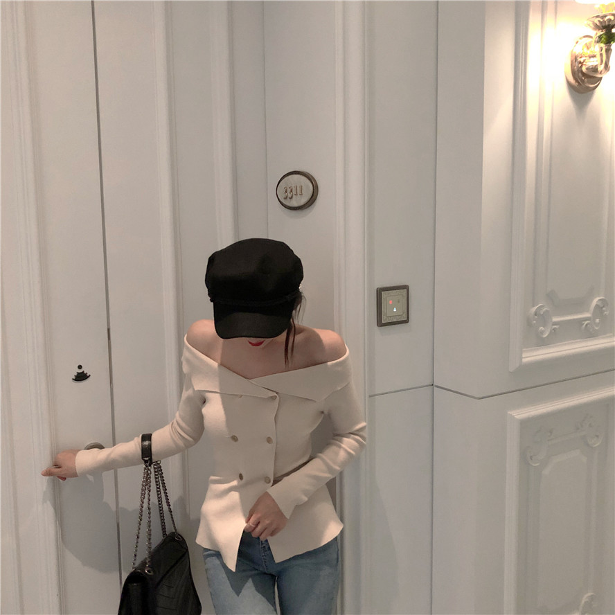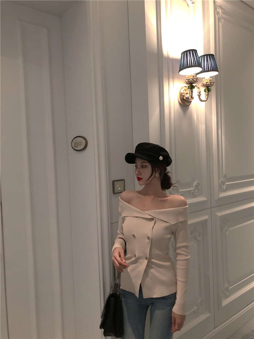 / 性感新款修身上衣露肩大翻領一字肩露鎖骨小心機雙排口針織小開衫