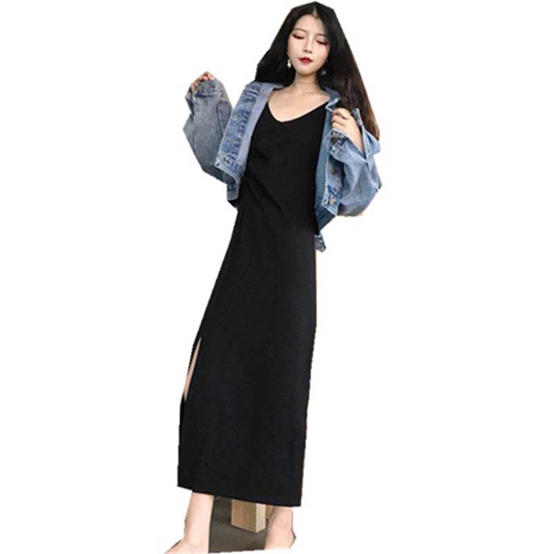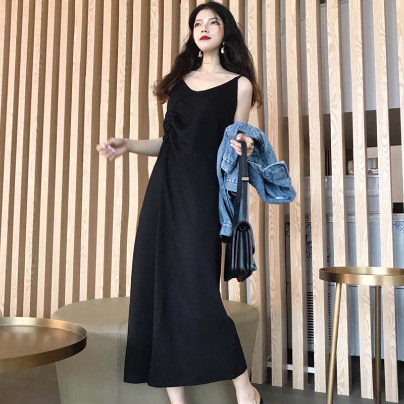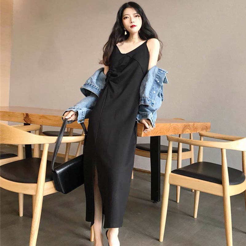 / 溫柔風開叉長款打底黑色吊帶連衣裙子秋裝2018新款氣質長裙女內搭