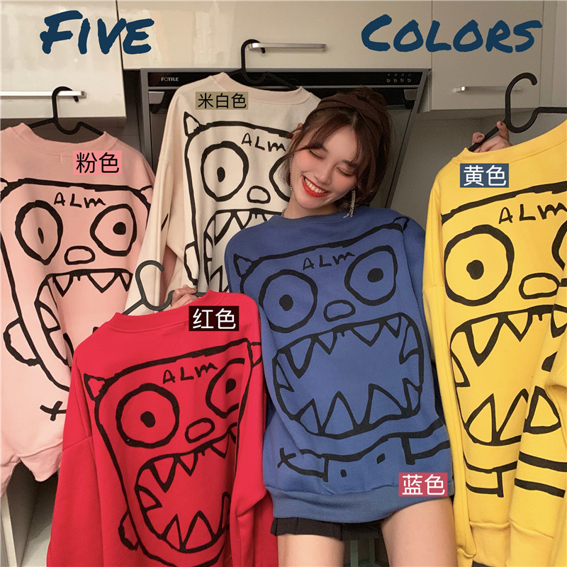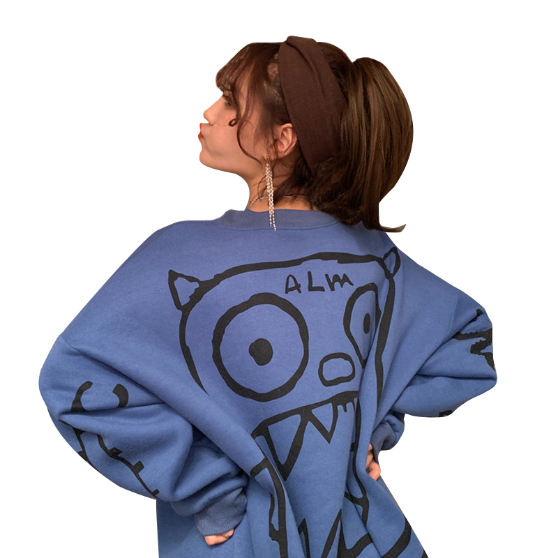 / 秋冬女裝韓版中長款慵懶風寬松涂鴉卡通加絨加厚套頭衛衣上衣外套