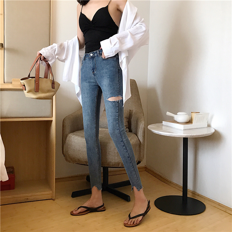 / 牛仔褲女2018韓版顯瘦chic港味復古九分高腰時尚小腳褲破洞褲子潮