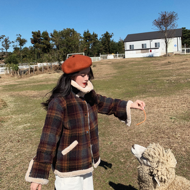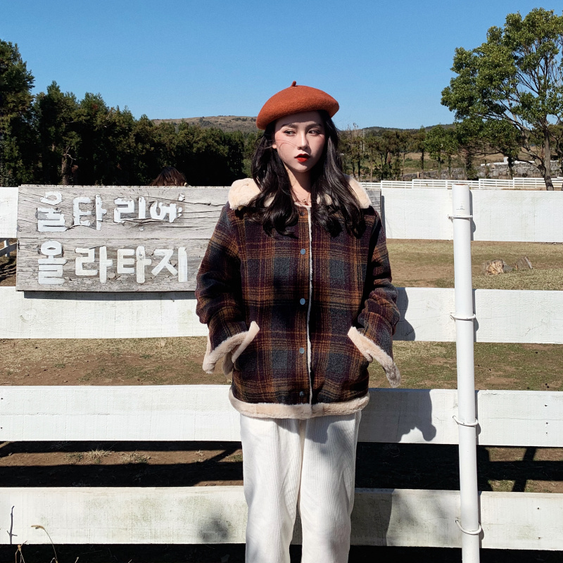 / 加厚復古chic加絨毛呢格子羊羔毛短款外套女秋冬2018新款棒球服潮