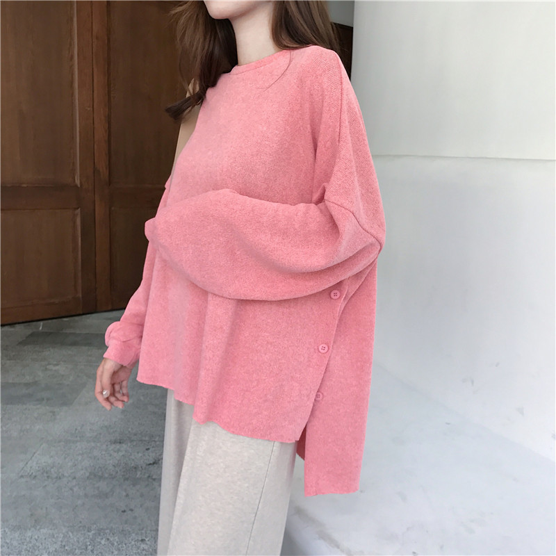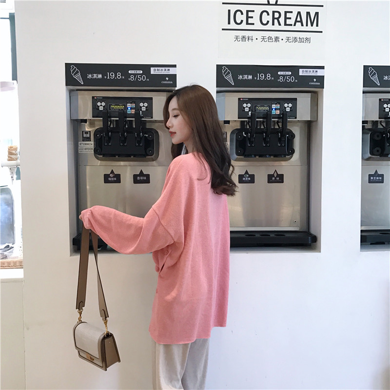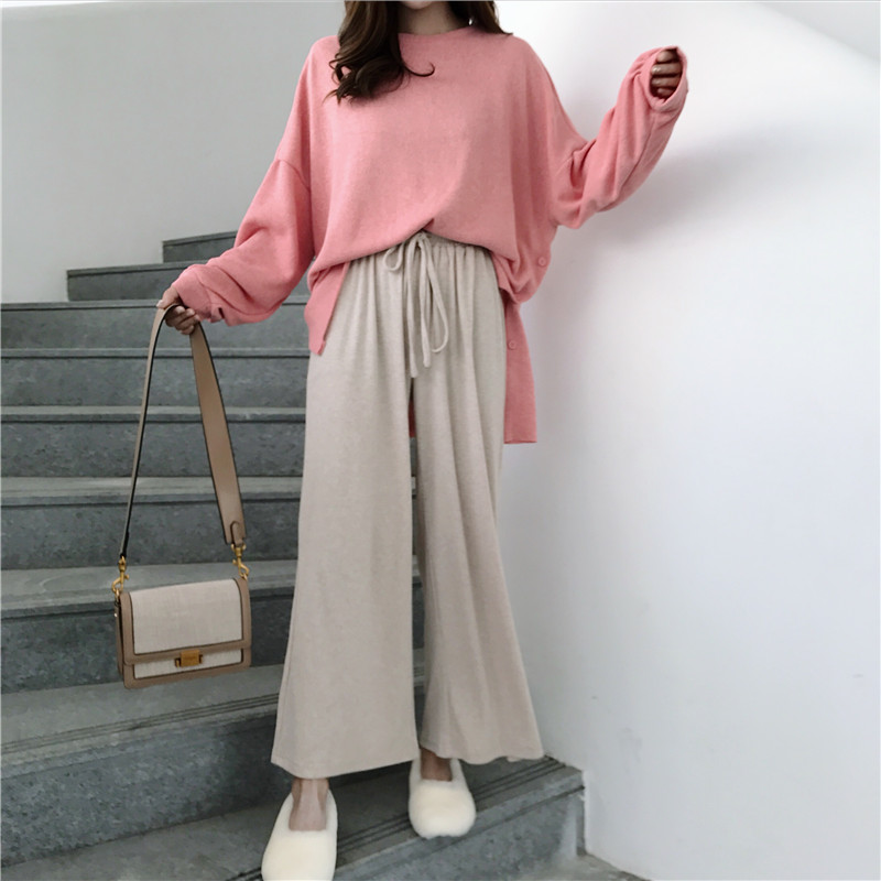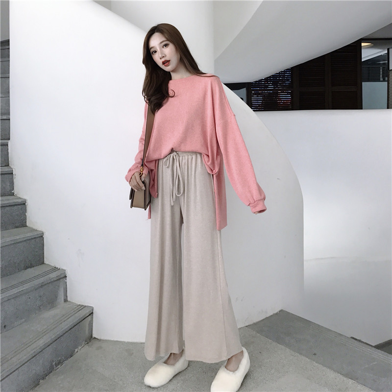 / 女神套裝秋兩件套純色打底薄款粉色針織上衣+高腰墜感休閑闊腿褲