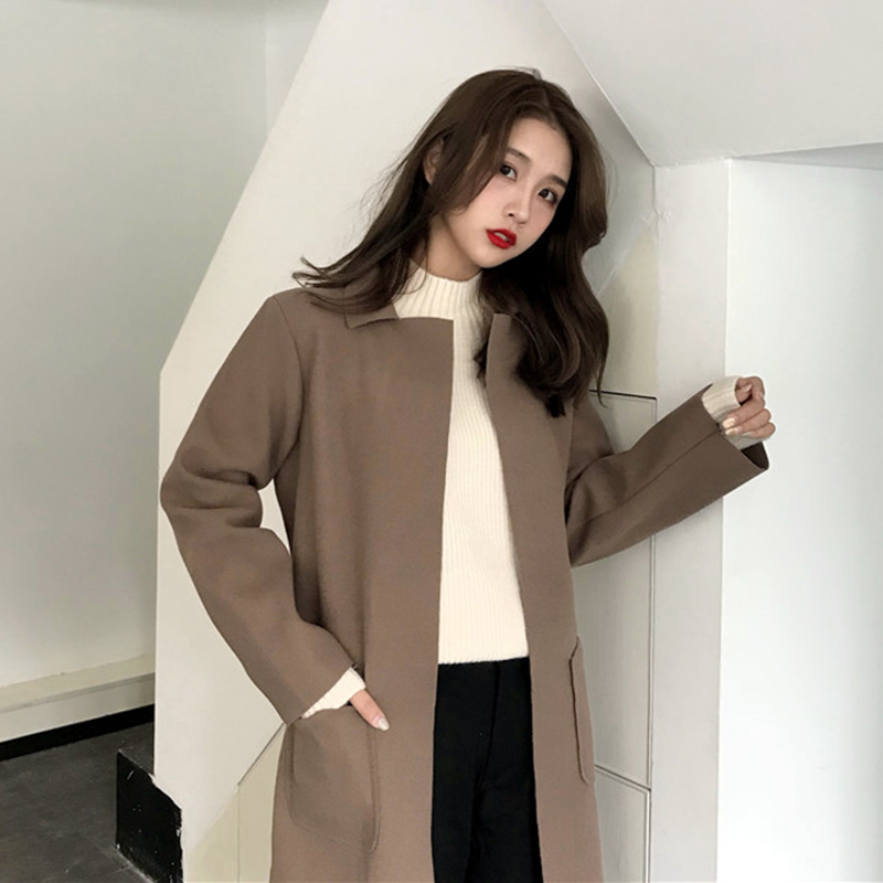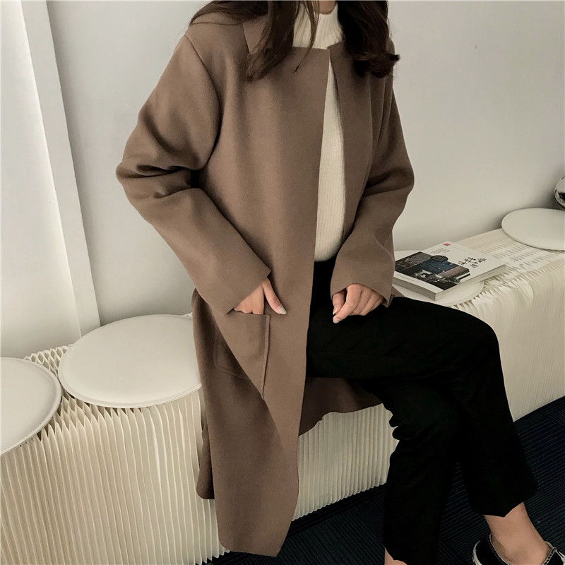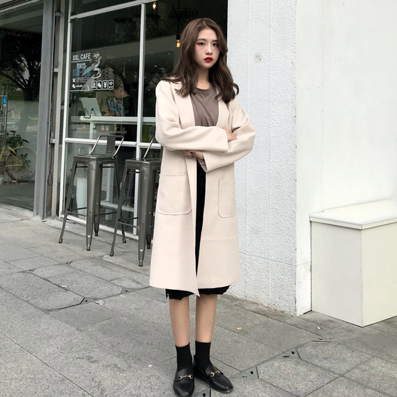/ 中長款毛呢外套秋裝女2018新款簡約純色呢子風衣系帶休閑開衫上衣