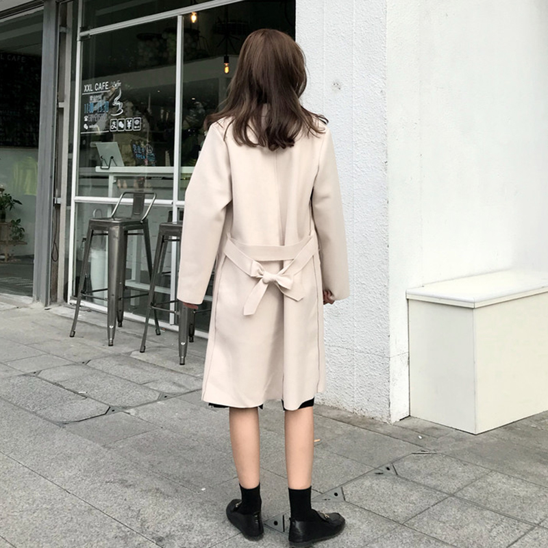 中長款毛呢外套秋裝女2018新款簡約純色呢子風衣系帶休閑開衫上衣
