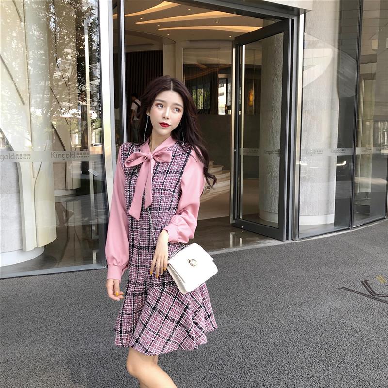 / 時尚氣質新款秋季chic韓版百搭長袖襯衫格子中裙淑女蝴蝶結連衣裙