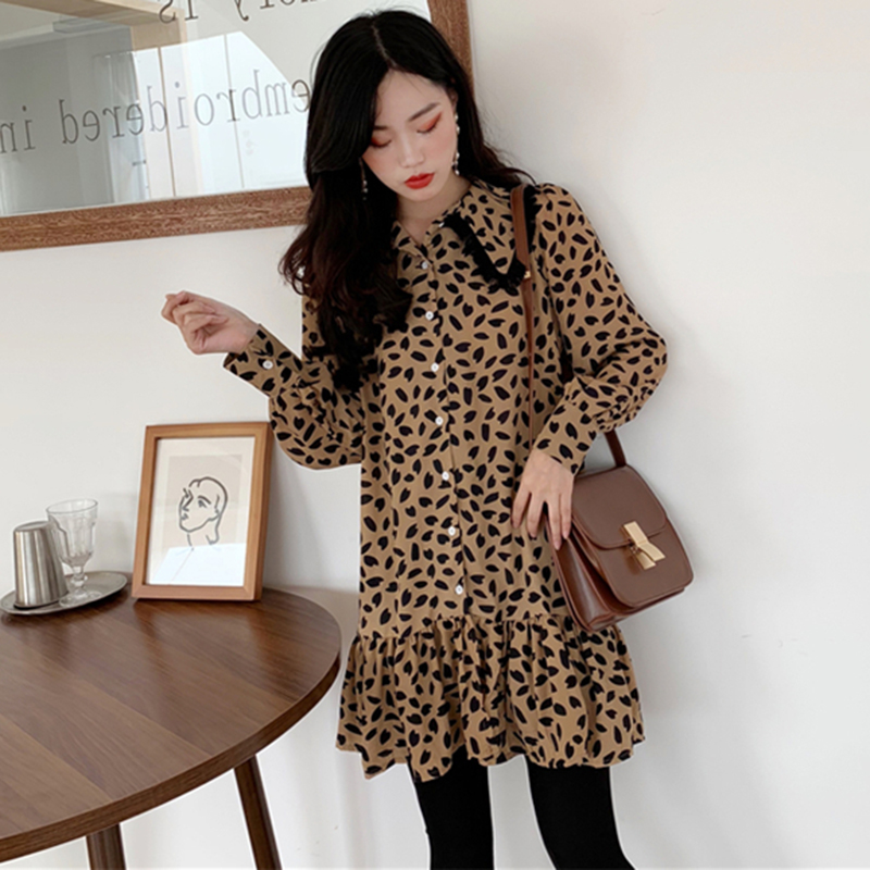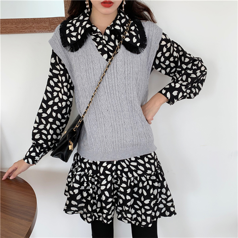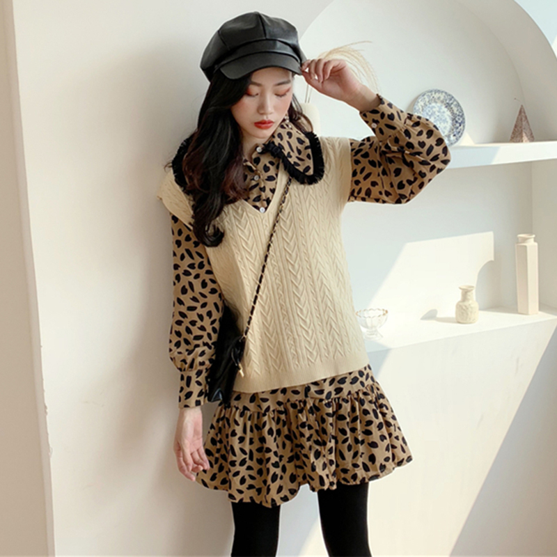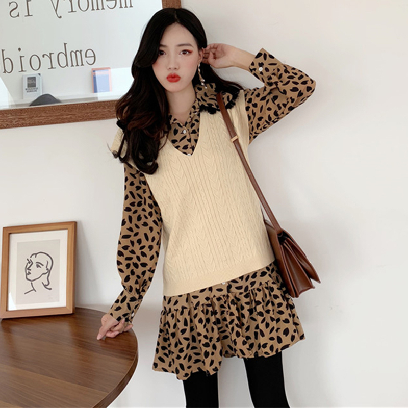 / 時尚赫本套裝女秋冬新款V領毛衣針織馬甲氣質豹紋長袖連衣短裙子