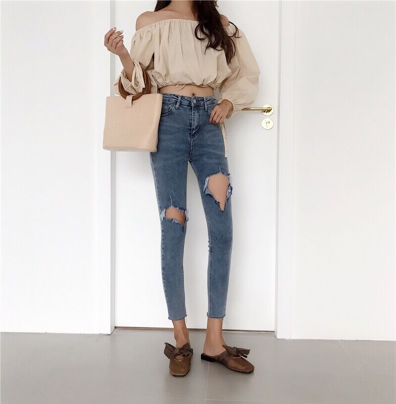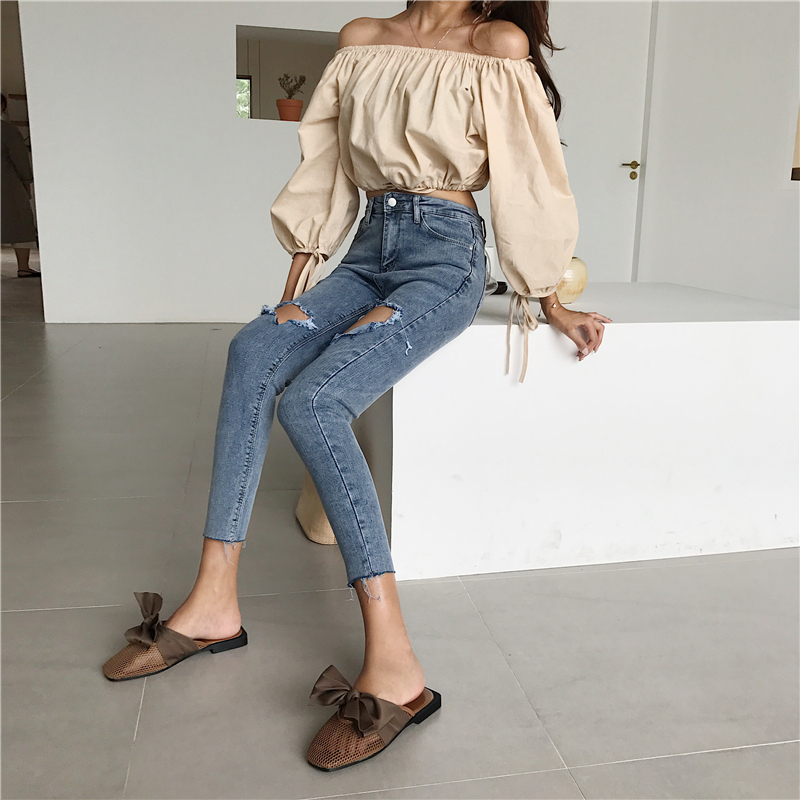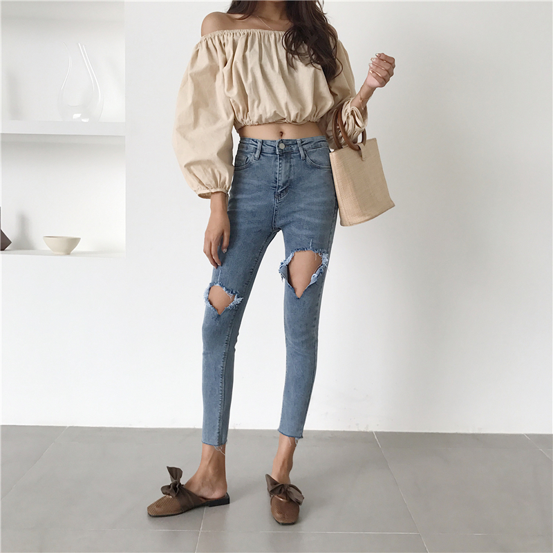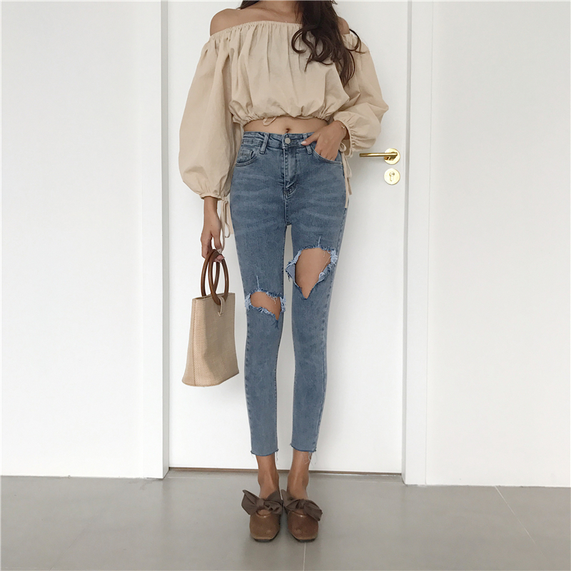 褲子女2018新款韓版緊身顯瘦百搭高腰破洞九分褲彈力牛仔褲小腳褲