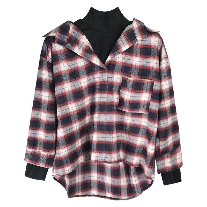 港味復古格子襯衫女秋裝新款拼接假兩件襯衣學生寬松百搭長袖上衣
