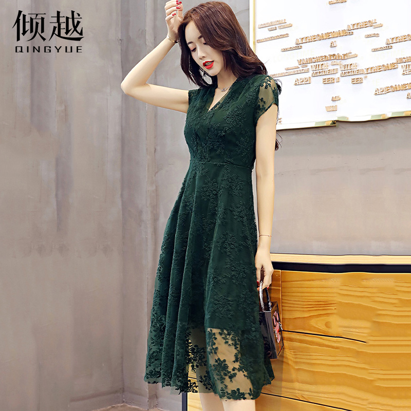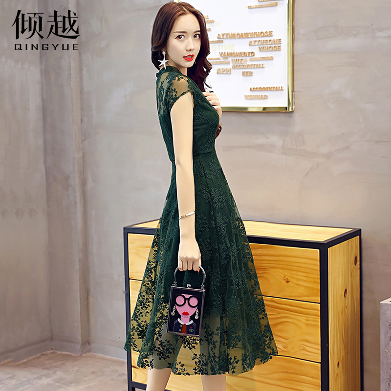 蕾絲連衣裙2017夏季新款韓版顯瘦氣質v領a字性感鏤空黑色裙子女潮