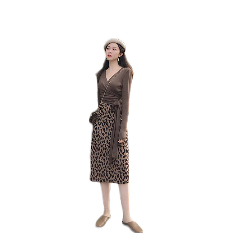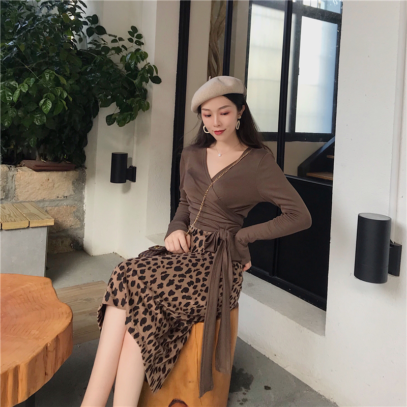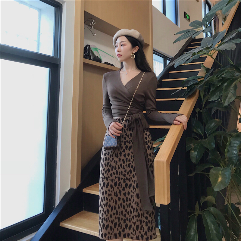 / 女神套裝秋裝復古法式綁帶V領針織上衣+提花高腰豹紋針織半身裙