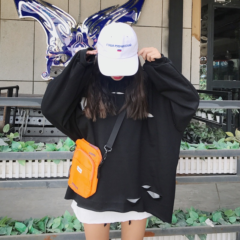 / 春季女裝新款韓版原宿風撞色破洞拼接假兩件上衣學生寬松休閑衛衣