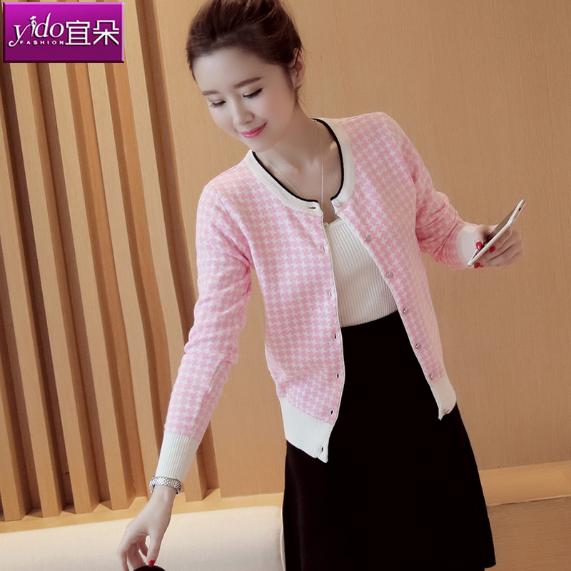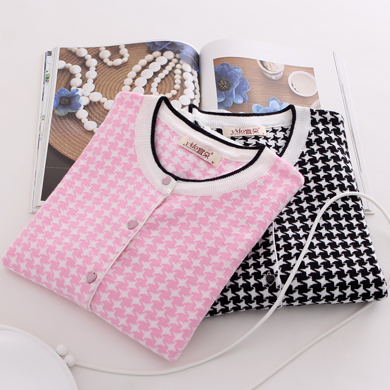 / 春季新款長袖針織衫女開衫春秋常規毛衣外套女千鳥格針織開衫