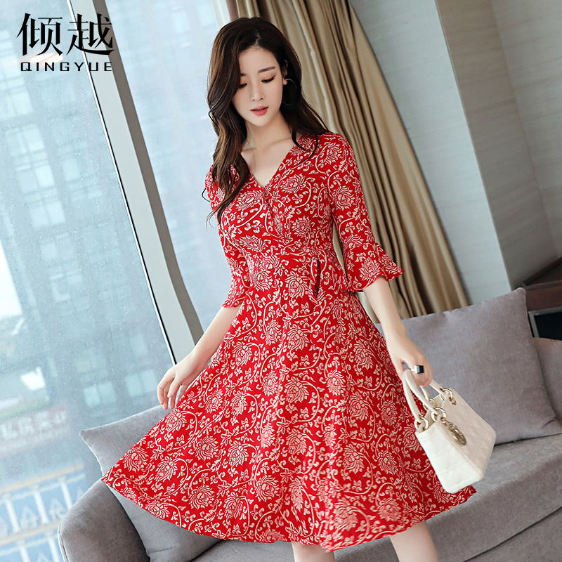 傾越2017春夏季女裝雪紡連衣裙中長款短袖喇叭袖裙子中長裙A字裙