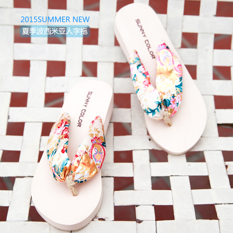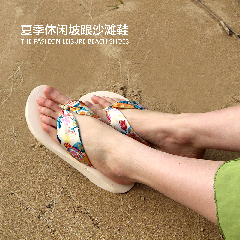 夏季波西米亞沙灘鞋 坡跟女士涼拖鞋 防滑松糕跟人字拖