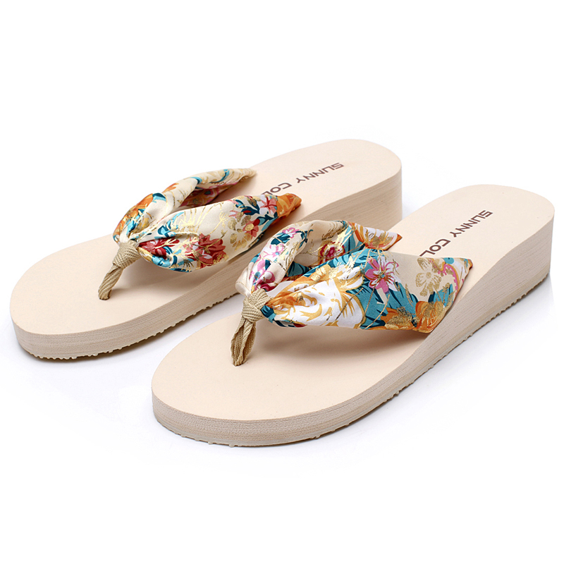 / 夏季波西米亞沙灘鞋 坡跟女士涼拖鞋 防滑松糕跟人字拖