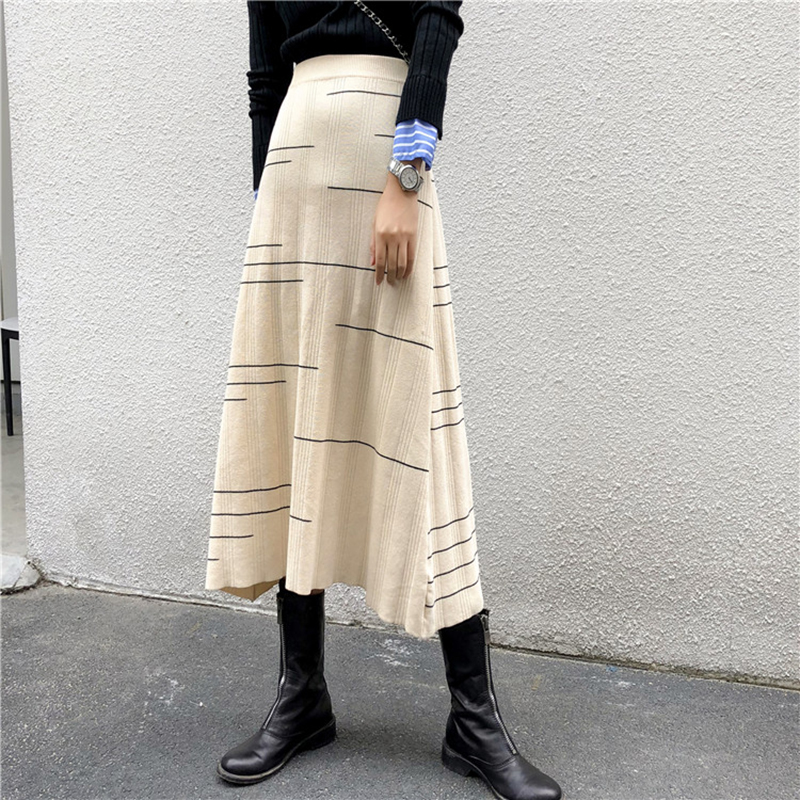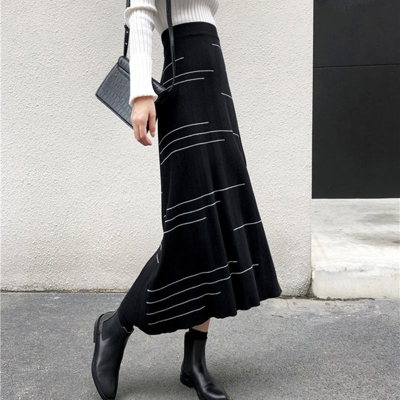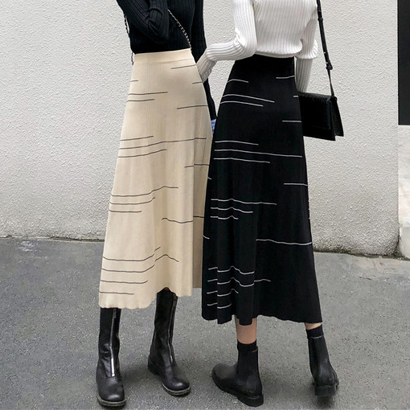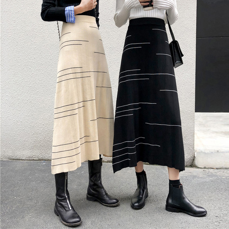 / 復古風高腰顯瘦針織半身裙子女秋冬裝新款學生時尚拼色A字中長裙