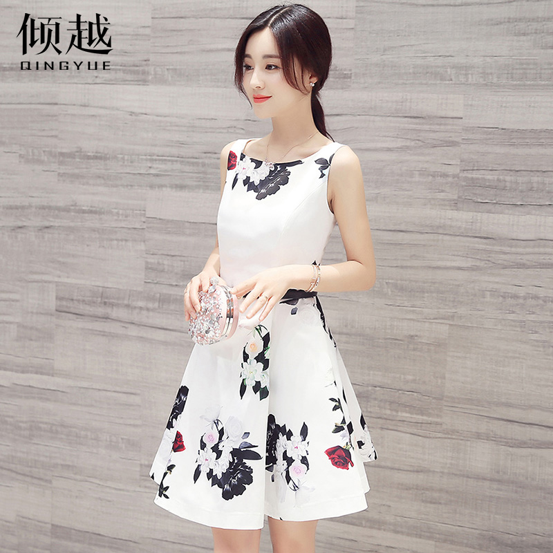 / 2017夏裝新款氣質淑女雪紡連衣裙無袖修身顯瘦束腰中長款印花裙子