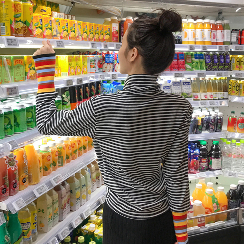 彩虹條紋高領針織衫女秋冬裝新款修身顯瘦加絨打底上衣長袖T恤潮