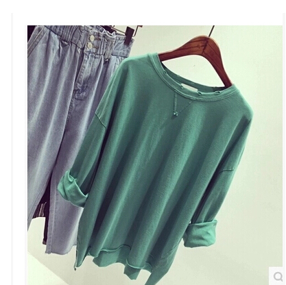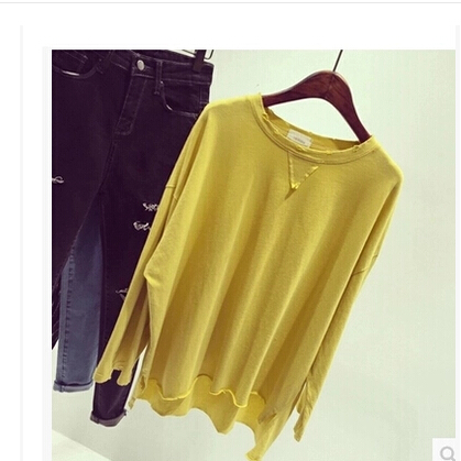秋季糖果色寬松開叉破洞上衣女裝新款韓版百搭圓領長袖T恤衫
