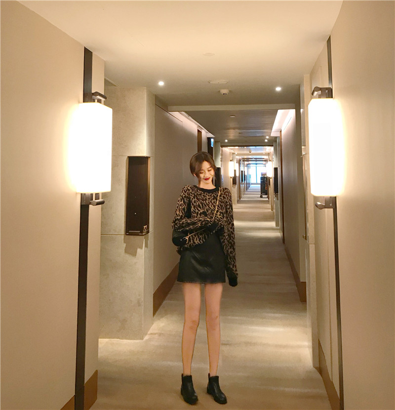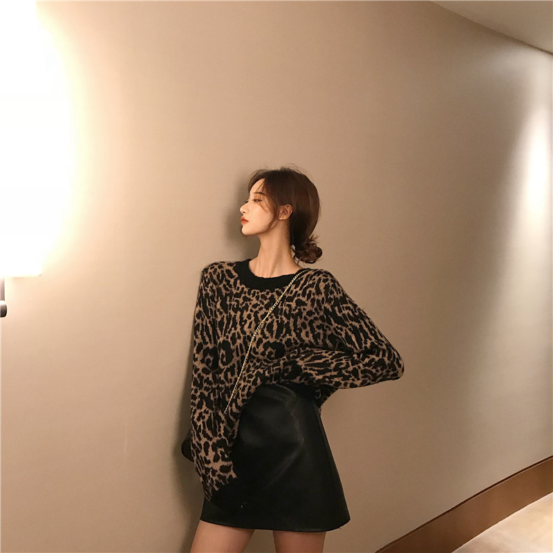 / 韓版網紅同款2018新款秋冬寬松慵懶風套頭毛衣女豹紋毛線針織上衣