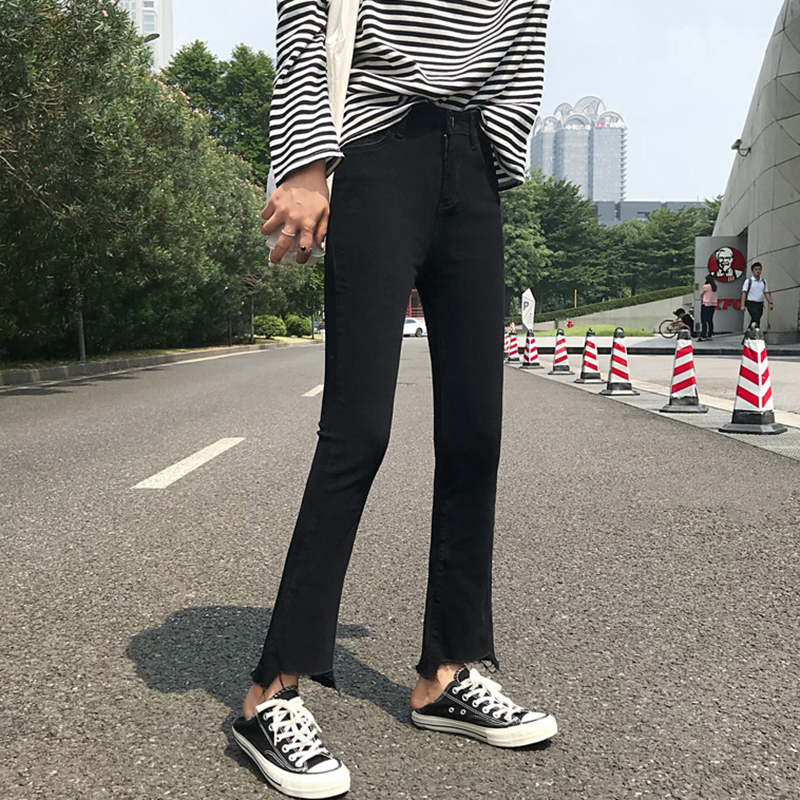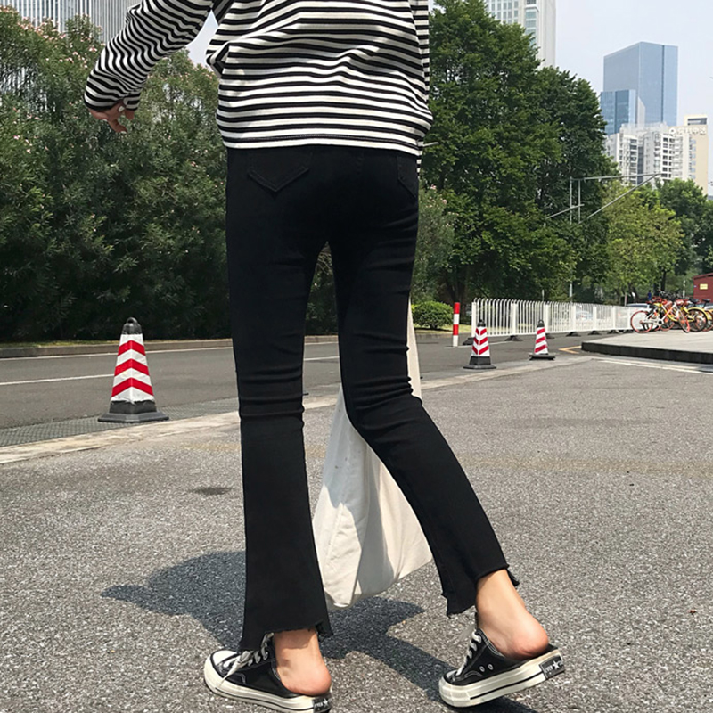 / 不規則褲腳牛仔褲女2018秋裝新款高腰微喇褲子學生顯瘦黑色九分褲