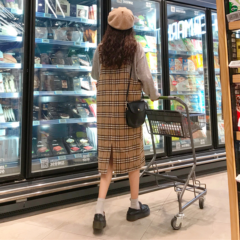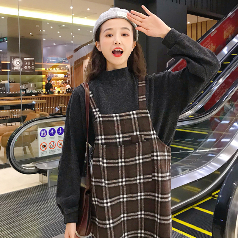時尚套裝女秋冬2018新款慵懶寬松半高領衛衣復古格子毛呢背帶裙子