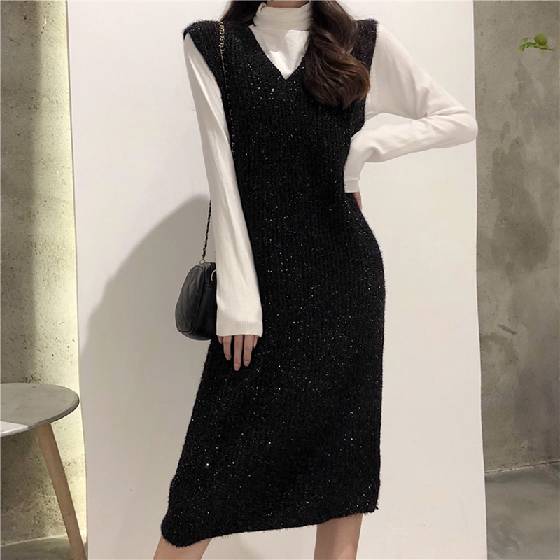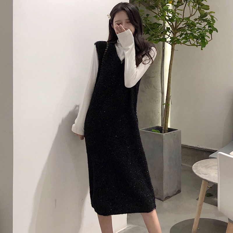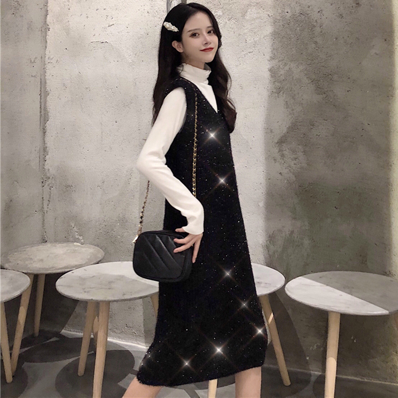 赫本套裝女秋冬新款氣質亮絲V領背心連衣裙子修身顯瘦針織打底衫