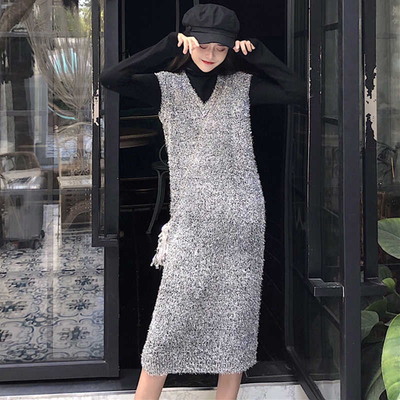 / 赫本套裝女秋冬新款氣質亮絲V領背心連衣裙子修身顯瘦針織打底衫