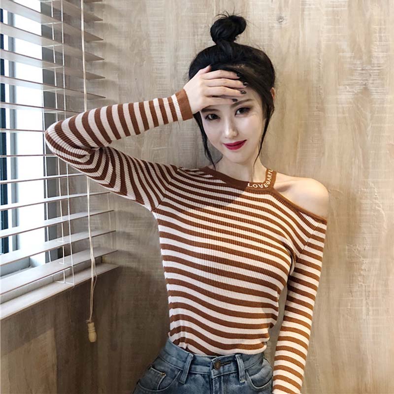 / 秋裝女2018新款小心機露單肩掛脖針織衫字母條紋修身長袖打底上衣