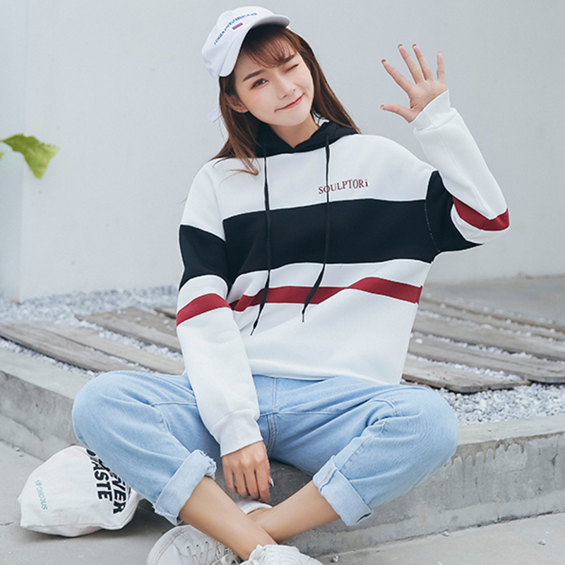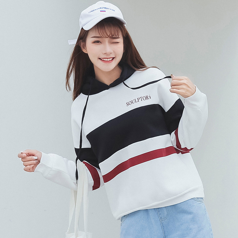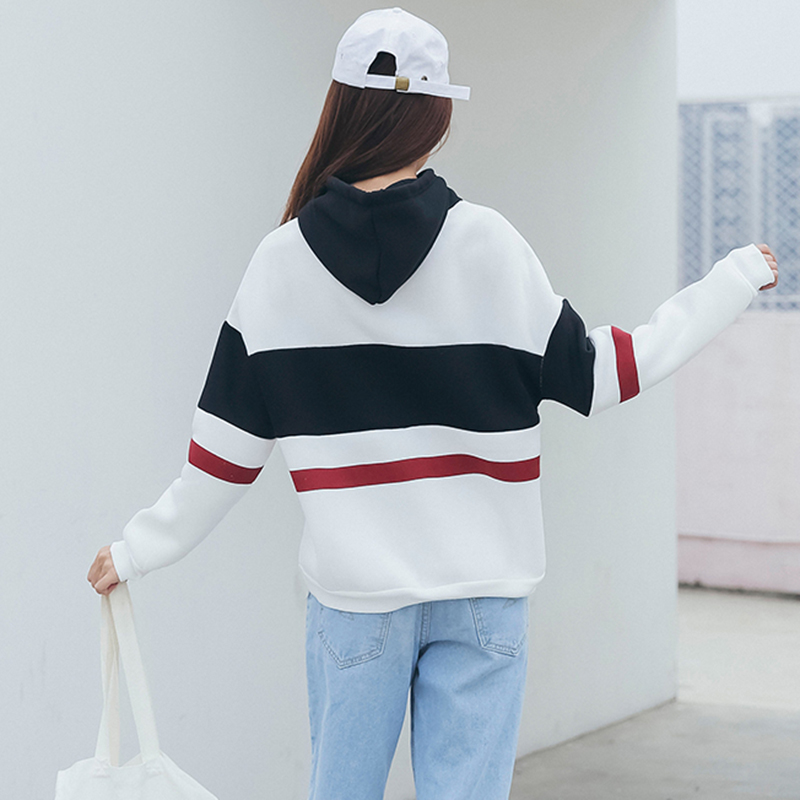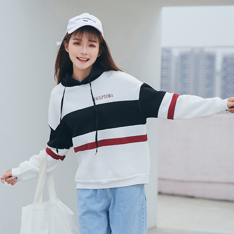 學院風長袖加絨衛衣女秋冬裝2018新款韓版百搭寬松拼色連帽外套潮