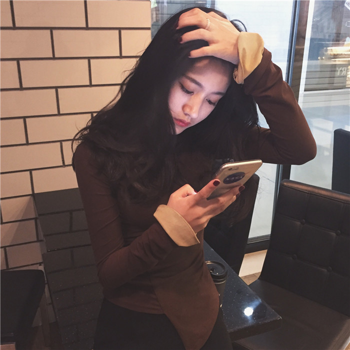 / 秋裝新款韓版上衣女純色T恤修身顯瘦長袖復古百搭荷葉袖打底衫潮