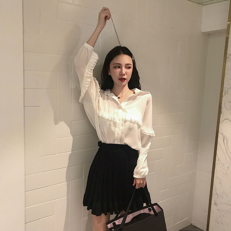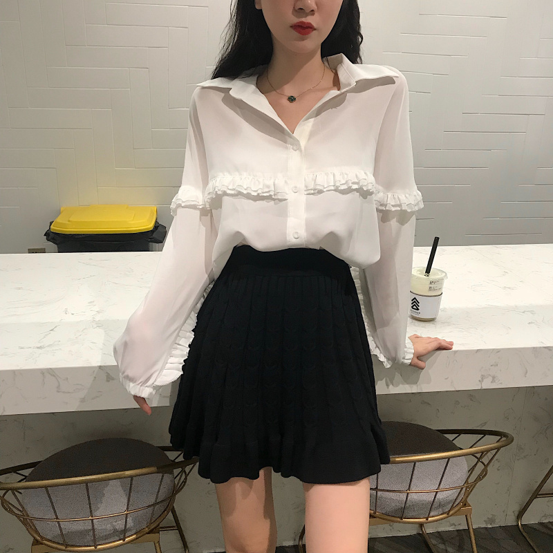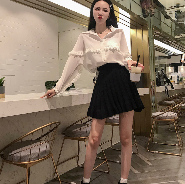 / 網紅同款套裝氣質慵懶長袖寬松白襯衫+針織半身高腰百褶裙兩件套