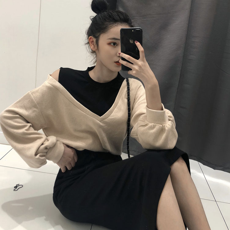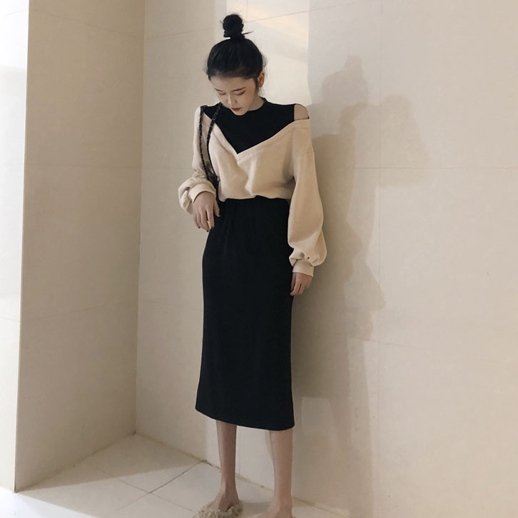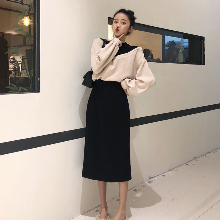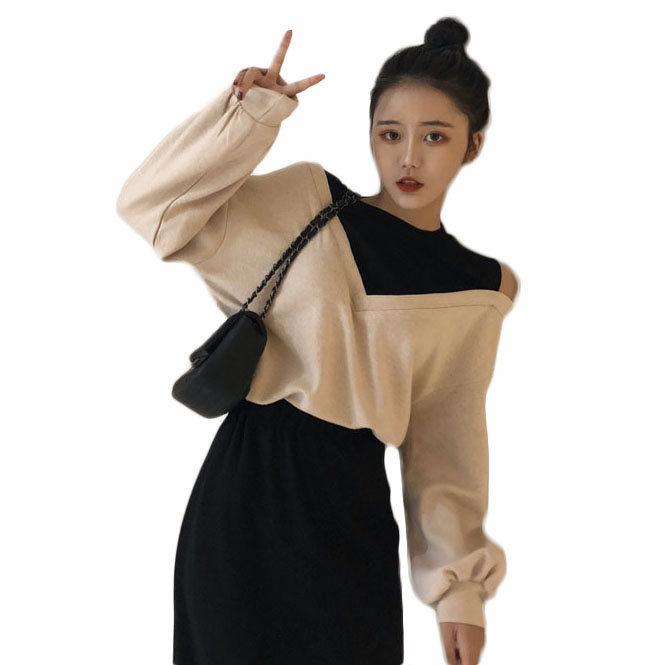 / 韓版寬松顯瘦假兩件拼接露肩衛衣女2018新款+百搭高腰純色半身裙