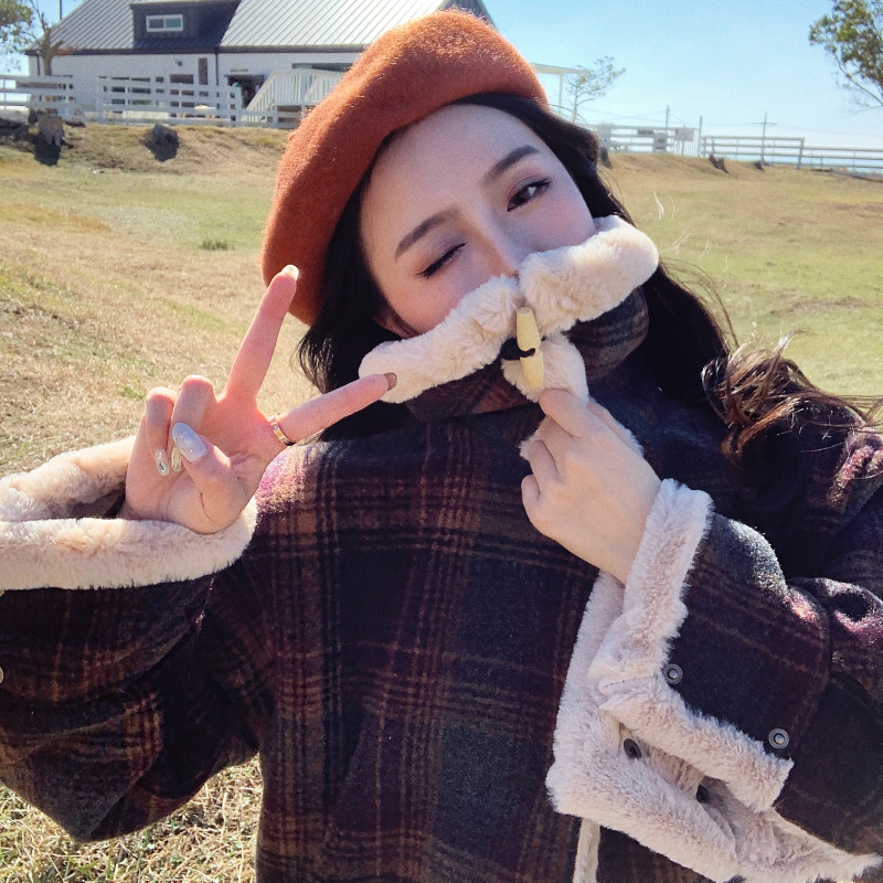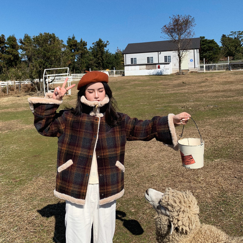 新款韓版冬季時尚學生加厚復古chic保暖加絨毛呢子格子短款外套女