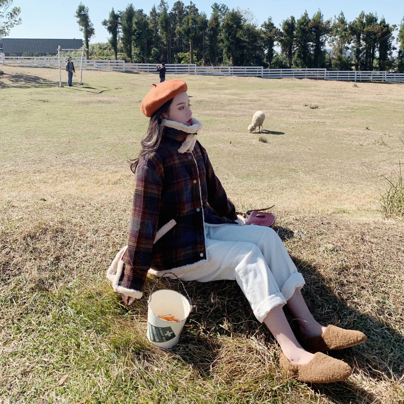 / 新款韓版冬季時尚學生加厚復古chic保暖加絨毛呢子格子短款外套女