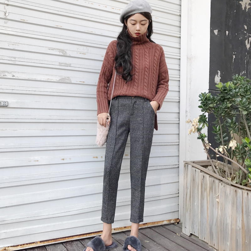 / 韓國chic復古褲子女秋2018新款毛呢格子哈倫褲高腰顯瘦九分西裝褲