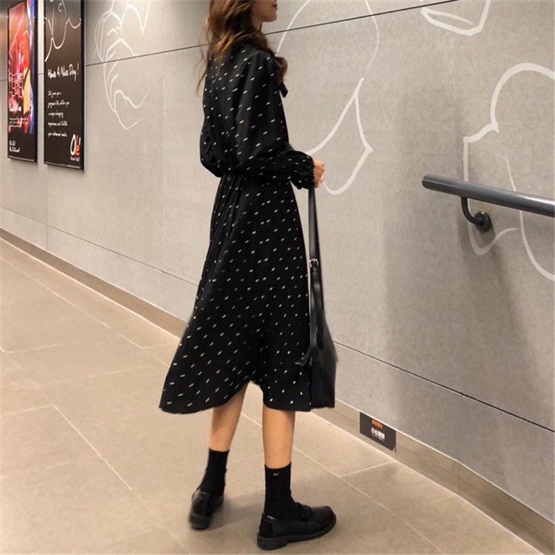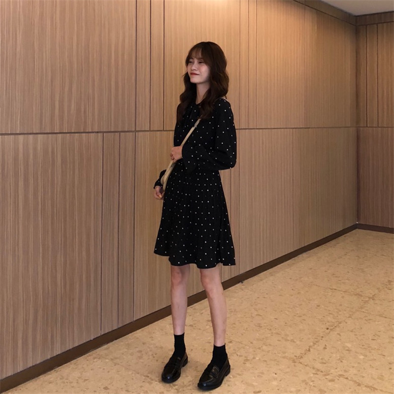 / 晚晚風新款韓版寬松秋季秋款波點長袖裙擺壓褶連衣裙長短款閨蜜裝