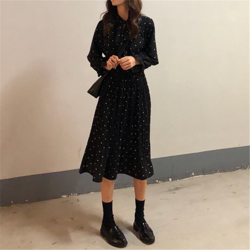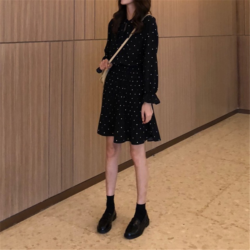 晚晚風新款韓版寬松秋季秋款波點長袖裙擺壓褶連衣裙長短款閨蜜裝