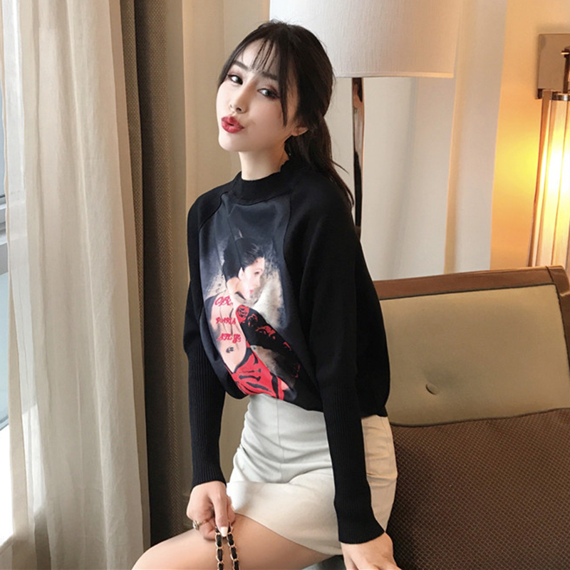 / 秋裝女裝2018新款寬松顯瘦蝙蝠袖薄款毛衣印花黑色針織打底衫上衣