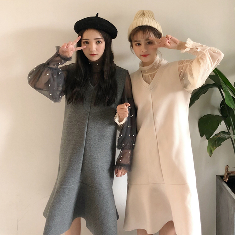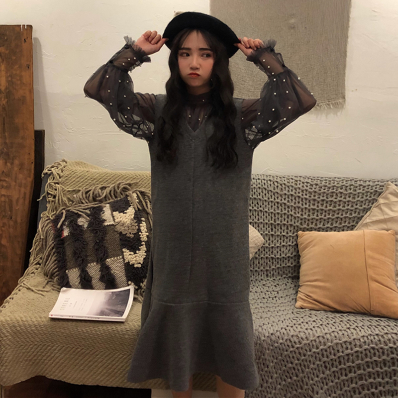 / 心機女套裝秋冬新款兩件套顯瘦長袖雪紡上衣毛呢魚尾背心連衣裙子