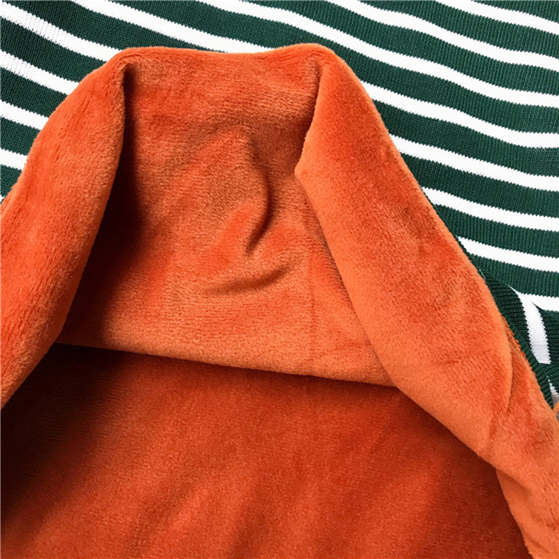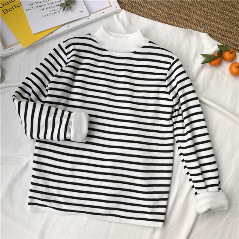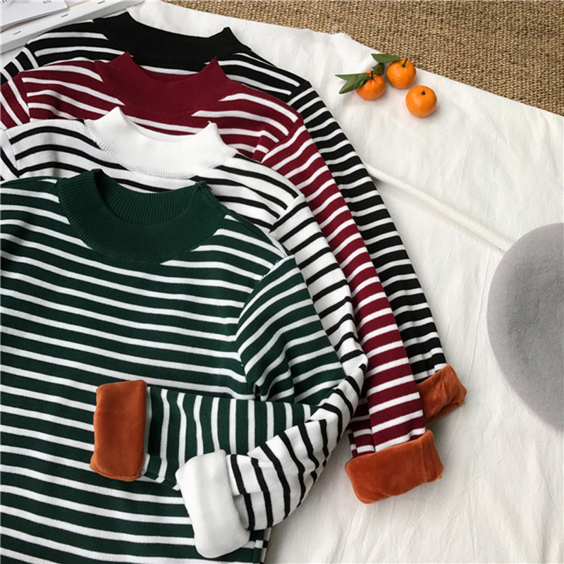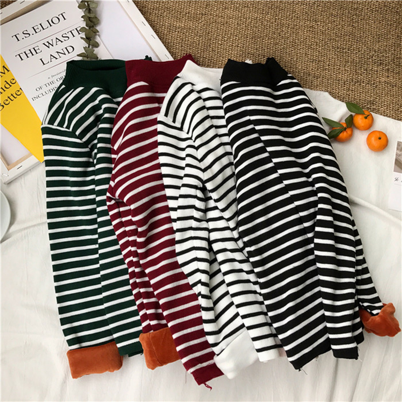 學生寬松上衣秋冬女裝2018新款加絨保暖毛衣條紋長袖針織打底衫潮